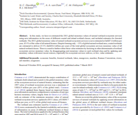 In this study, we have re-estimated the 2011 global monetary values of natural wetland ecosystem services using new information on the areas of different coastal and inland wetland classes, and included estimates for forested wetlands. Click on the link below to access the full article