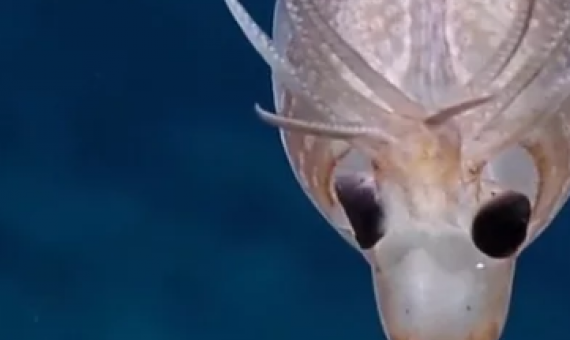 The team aboard the Exploration Vessel Nautilus team used a camera to  enjoy a close-up with a see-through piglet squid (Helicocranchia sp.), named for its large siphon that looks like a snout. Click on the link below to read the full article.